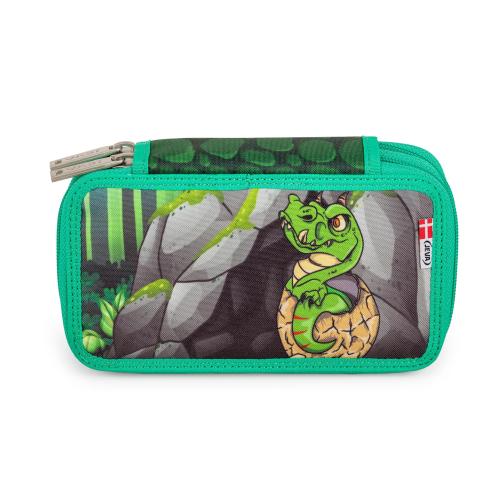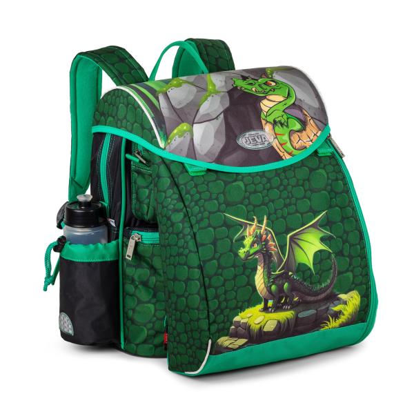 A beautiful dragon is placed on the accompanying gym bag and on the front of the lunchbox pocket of the schoolbag. On the lid, there is also a dragon about to hatch from its egg. The fabric of the schoolbag is patterned in dark green and black – the bag's trim has a lovely green color as a contrast.