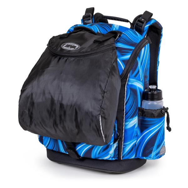 The JEVA school bag Lightning U-TURN is perfect for children from 1st to 4th grade. The Lightning bag is made of a waterproof, patterned polyester in blue, black, and white shades, with black zippers and fittings. It includes a black gymnastics bag/mini backpack and a drinking bottle from Plast-Team (color: Black).