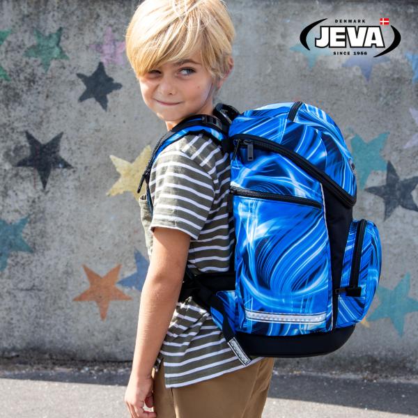 The four padded support points on the back fit perfectly against the child's back, providing proper ergonomics and support. At the top of the straps, the school bag features JEVA's "EASY-ADJUST system", allowing for 7 simple centimeters adjustment for the back - thereby accommodating a wide age range from 1st to 4th grade. The adjustable chest strap, padded and contoured straps, and the smart elastic waist belt EASY-BELT ensure optimal comfort and weight distribution.