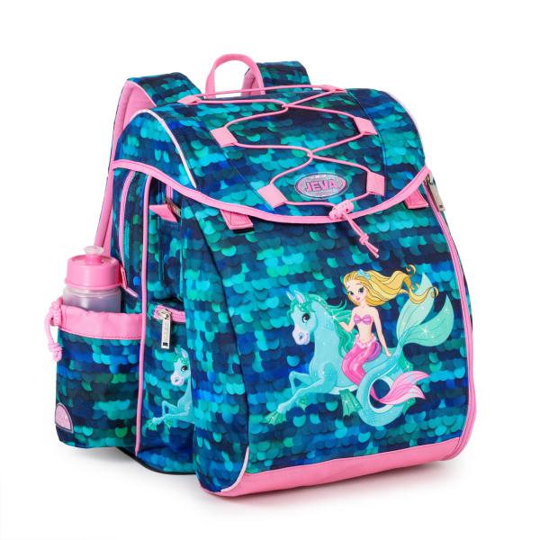 Beautiful mermaid schoolbag from the 2022 collection. This schoolbag is made of waterproof polyester with a beautiful full colour printed pattern in blue and green colours. Back, bindings, and straps are all in a lovely rosy colour. Trimmings and strings are also rosy. Suitable for primary school juniors.