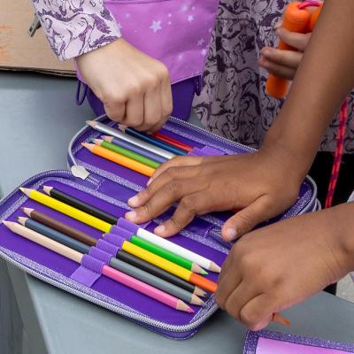 Ergonomic pencils, coloured pencils, rubber, ruler and pencil sharpener. From January 2018 the new colours in models ONEZIP and TWOZIP, features transparent pocket for UNI-login and copy-card.