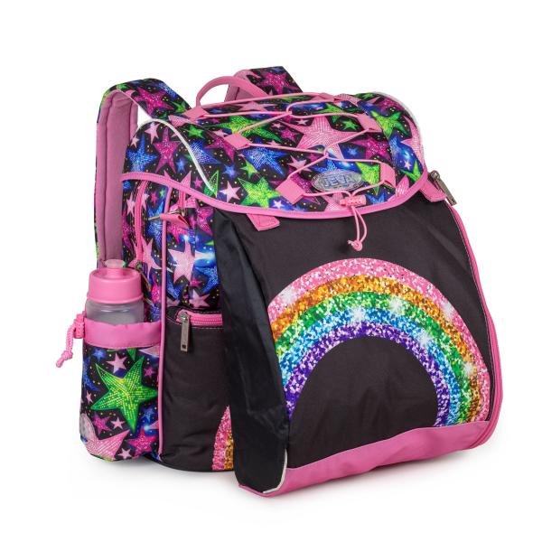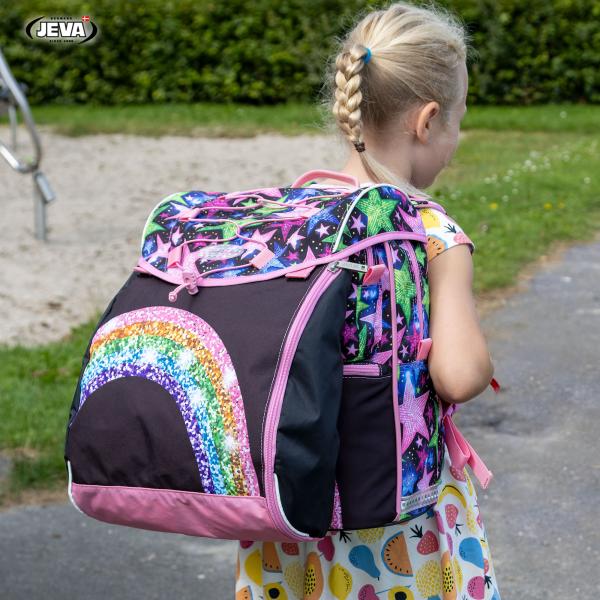 School bag with disco stars and a beautiful rainbow with sequin effect. The school bag is sewn in black, waterproof polyester, partly with beautiful stars in many colors. In the front of the school bag itself and also on the gym bag, there is a beautiful rainbow. Trimmings and straps are in a nice light pink. Suitable for children in 1st to 3rd grade.